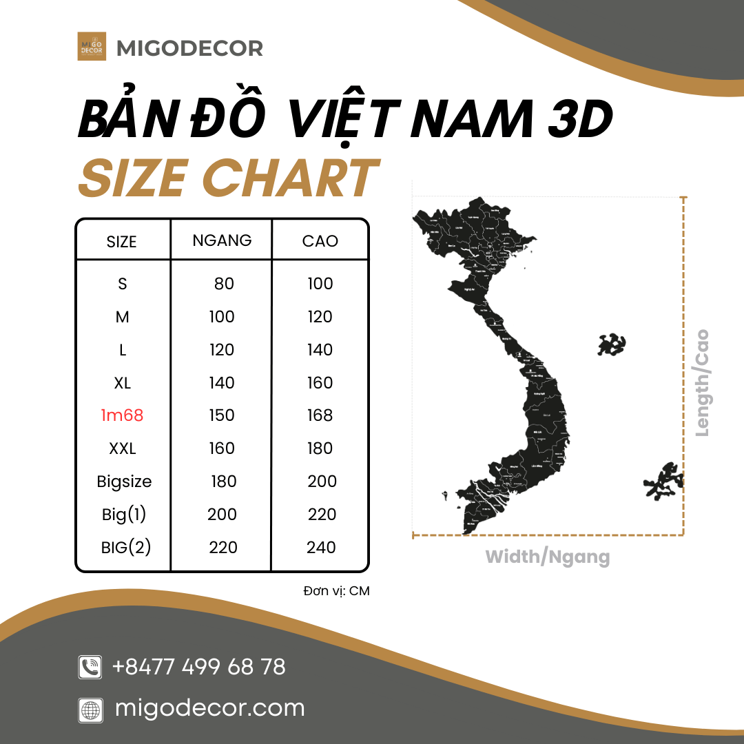 Kích thước Tranh Gỗ Bản Đồ Hành Chính Việt Nam 34 Tỉnh Thành: Cao 1m, cao 1m2, cao 1m4, cao 1m6, cao 1m8, cao 2m,.. và kích thước đặt riêng theo yêu cầu.